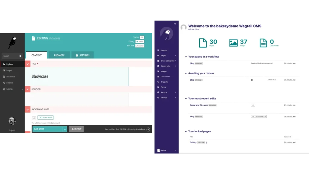 Wagtail has a modern dashboard that helps editors manage content easily. The admin interface is simple to use.